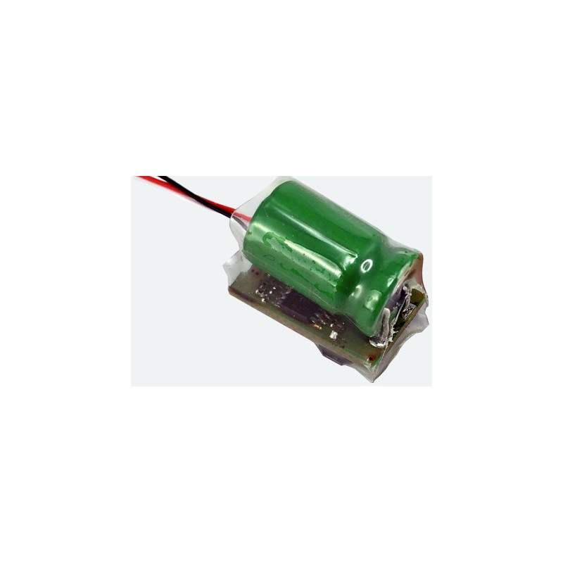 The new ESU PowerPack Mini can be wired to all fourth and fifth generation ESU decoders. It reliably supplies energy to your locomotive when traversing dirty track or long turnout ladders. With its energy storage (1 Farad capacity) the unit supplies power to all light and motor functions as well as to the sound module. Subject to the energy consumption of your model it may continue to move for up to three seconds. The PowerPack Mini incorporates an integral charging circuit controlled by the decoder. Therefore it may be connected even during programming. In order to avoid an undue load on the booster in case there are several models in the same booster sector, the charging current is limited. The buffer time can be reduced by means of a CV. This may be useful to assure the correct stopping position ahead of signals showing the Stop” aspect (red signal). Although it is considerably smaller than its predecessor, the space requirements of the PowerPack Mini of about 15.7 mm x 9.7 mm x 13 mm must be taken into account when installing this unit. A three-pole wire harness connects the PowerPack Mini to the decoder. The wires are already soldered to the PowerPack Mini and must be soldered to the appropriate solder pads of the decoder.